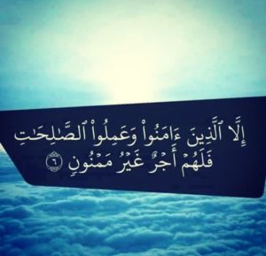 “إِنَّ ٱلَّذِينَ ءَامَنُواْ وَعَمِلُواْ ٱلصَّٰلِحَٰتِ لَهُمۡ أَجۡرٌ غَيۡرُ مَمۡنُونٖ ٨”. (سورة فصّلت)