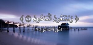 “أَرَءَيۡتَ ٱلَّذِي يُكَذِّبُ بِٱلدِّينِ ١ فَذَٰلِكَ ٱلَّذِي يَدُعُّ ٱلۡيَتِيمَ ٢ وَلَا يَحُضُّ عَلَىٰ طَعَامِ ٱلۡمِسۡكِينِ ٣ فَوَيۡلٞ لِّلۡمُصَلِّينَ ٤ ٱلَّذِينَ هُمۡ عَن صَلَاتِهِمۡ سَاهُونَ ٥ ٱلَّذِينَ هُمۡ يُرَآءُونَ ٦ وَيَمۡنَعُونَ ٱلۡمَاعُونَ ٧”. (سورة الماعون)