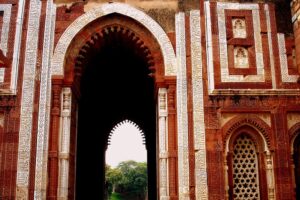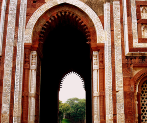 علائي دروازة (بوابة السلطان علاء الدين الخلجي) [15](دلهي) داخل حرم قطب منار: مزينة بحجر رملي أحمر ومزخرفة بالرخام الأبيض ومكتوبة بخط النسخ بحفر الرخام.