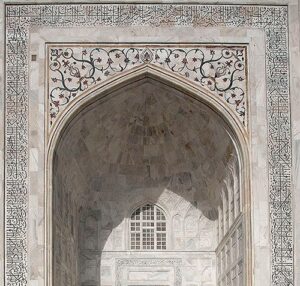واجهة تاج محل (آغرا): الآيات القرآنية مزخرفة بخط الثلث الجميل.